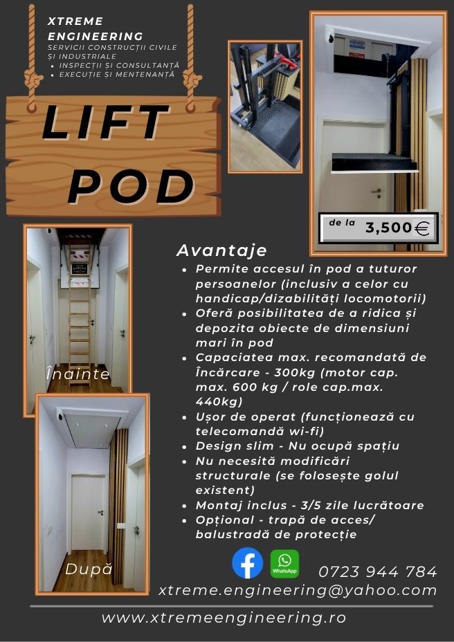Confecționare și instalare lift electric acces pod operat cu telecomada wi-fi. Capacitate motor 600kg.